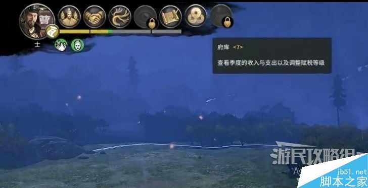 首先屏幕左上角,战役概览一栏,从上到下分别为年份季节、府库资金、粮食、资源。