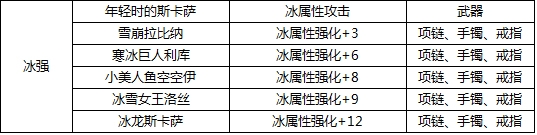 DNF冰属性强化宝珠有冰龙斯卡萨12冰强宝珠、冰雪女王洛丝9冰强宝珠、小美人鱼空空伊8冰强宝珠、寒冰巨人利库6冰强宝珠和雪崩拉比纳3冰强宝珠。