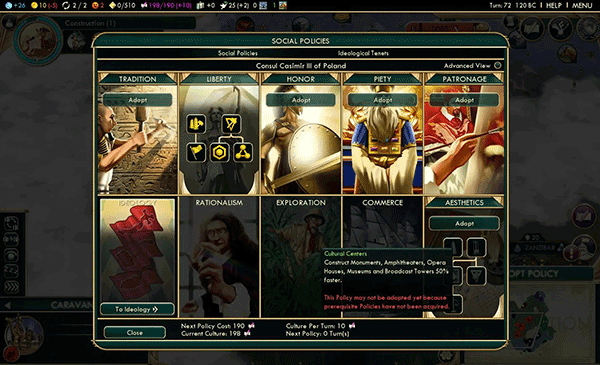 贸易,开门是首都金钱+25%,并解锁Big Ben,关门是每个贸易政策+1钱,可以从大贸易家的交易能力得到两倍的钱,并且可以用信仰购买大贸易家。