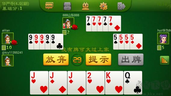 轮流出牌:其他出牌者在轮到自己出牌时,所出的牌必须比上一出牌者大,如果大不过或者不想出,可以弃权。如果连续三家弃权,由最后出牌玩家在下一轮得到任意出牌权,可以出任意牌型,没有任何要求。