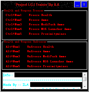 主要功能包括:锁定生命(Ctrl+Numpad1)、锁定子弹(Ctrl+Numpad2)、锁定医疗包(Ctrl+Numpad3)、锁定M16榴弹数量(Ctrl+Numpad4)和锁定感应地雷数量(Ctrl+Numpad5)。这些设置确保相关资源在游戏中不会减少,使玩家能够更专注于策略和探索。