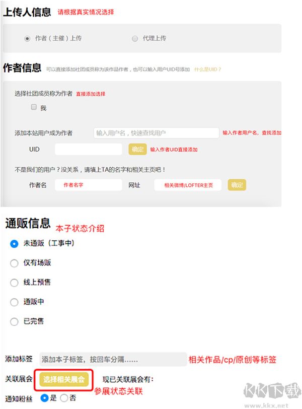 3. **上传作品**:通过导航栏选择【发新刊】,完善作品信息。若为社团创建者,可在【活动管理】中勾选参展;非创建者需通过【寄卖】系统关联社团。