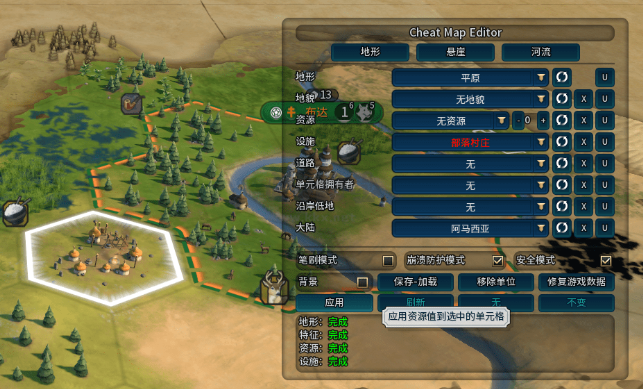 这个mod起到的时编辑地图的作用,如图所示,可以给地面添加资源、添加村庄、蛮族聚落等,非常方便,甚至还可以将某个地块上的兵消失掉。当然,温馨提醒,请不要随便添加还没研究出来的科技的资源,否则可能出错(比如在远古时代就随便添加煤、铝,有可能游戏直接崩溃!)