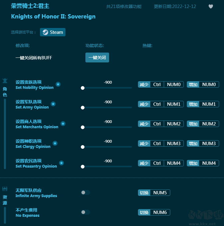 《荣誉骑士2:君主》是一款充满策略与挑战的王国建设类游戏,玩家将化身统治者,打造属于自己的强大王国,并率领士兵征战四方。为了给玩家带来更加丰富的游戏体验,KK下载站特别推出《荣誉骑士2:君主》二十一项修改器,为您的征服之路提供强力辅助。